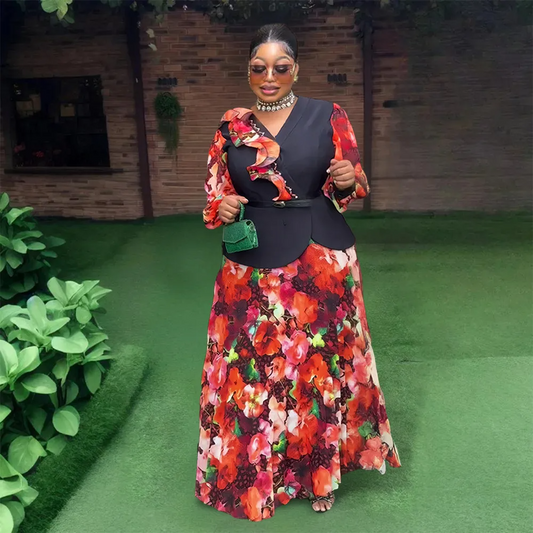 Ensemble deux pièces haut col en V et jupe plissée pour femmes africaines grande taille
