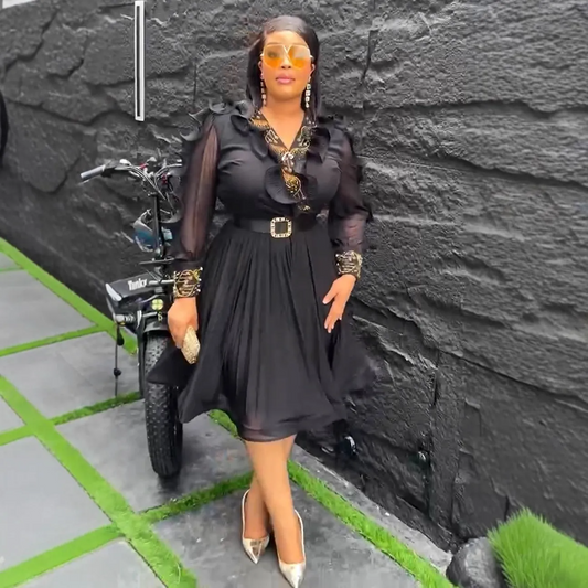 Robe élégante à col rabattu et volants transparents à manches courtes pour femmes de grande taille
